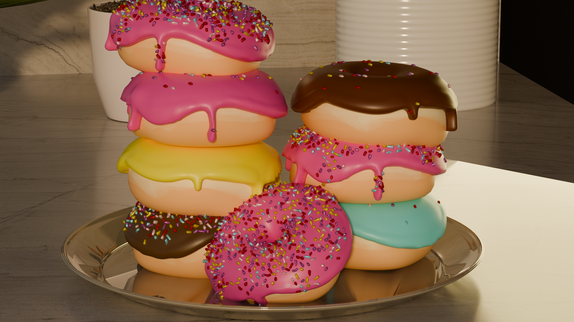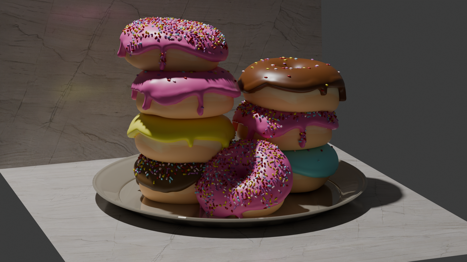 I worked carefully on textures and shaders to achieve a glossy glaze, soft dough surface, and colorful sprinkles. Lighting played a key role I used warm, natural light to create a cozy, almost cinematic atmosphere. Finally, I arranged the donuts into a stacked composition to make the scene more visually engaging.